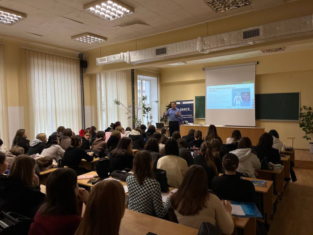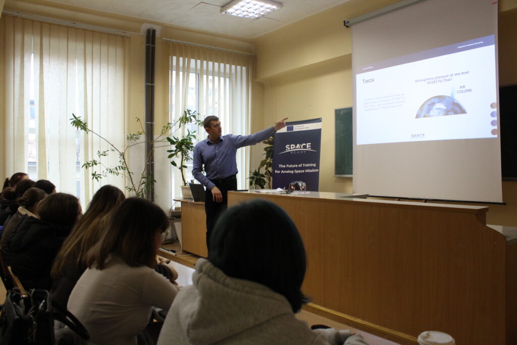 Лекцію-тренінг для студентів організувала команда SpaceReady КНУВС у складі проф. Володимира Коцюбинського, проф. Володимири Бойчук та доц. Лілії Туровської. Під час заняття було протестовано один із ключових модулів майбутнього е-learning курсу – Space Challenges (Gravity, Temperature, Pressure, Radiation), який знайомить майбутніх “аналогових астронавтів” з базовими фізичними та інженерними викликами космічного середовища.
