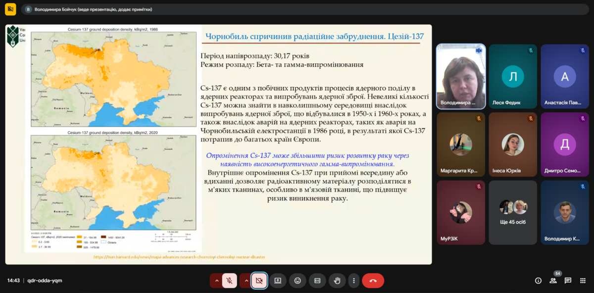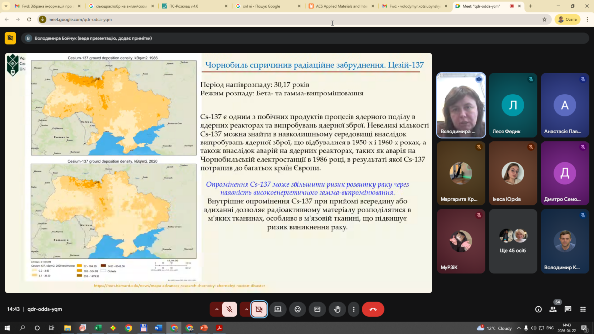 Із доповіддю виступила Володимира Михайлівна Бойчук, професор кафедри прикладної фізики і матеріалознавства. Тематика зустрічі була присвячена осмисленню значення Чорнобильської катастрофи для сучасного суспільства, науки, екологічної політики та системи підготовки фахівців. У контексті 40-річчя аварії на Чорнобильській АЕС особливого значення набуває не лише вшанування пам’яті про одну з найбільших техногенних катастроф ХХ століття, а й глибоке усвідомлення її уроків для сьогодення і майбутнього. Під час заходу було акцентовано увагу на тому, що Чорнобиль став не лише трагедією, яка змінила долі мільйонів людей і завдала масштабної шкоди довкіллю, а й потужним сигналом про необхідність формування високої культури безпеки у сфері використання ядерних технологій. Наслідки аварії переконливо продемонстрували, що питання радіаційної безпеки виходять далеко за межі суто технічної проблематики і охоплюють екологічні, медико-біологічні, соціальні, правові та етичні аспекти. Особливу увагу було приділено важливості поширення знань про природу іонізуючого випромінювання, принципи радіаційного захисту, оцінку ризиків, вплив радіації на людину та навколишнє середовище. У сучасних умовах знання є необхідними не лише для вузьких фахівців, а й для широкого кола студентської молоді, викладачів та громадськості, адже вони формують відповідальне ставлення до питань безпеки, допомагають протидіяти дезінформації та сприяють виробленню обґрунтованої громадянської позиції.